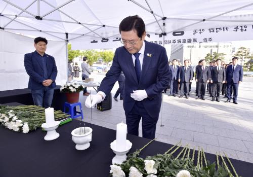 À̿뼷 ±¤ÁÖ±¤¿ª½ÃÀåÀÌ 16ÀÏ ¿ÀÀü µ¿±¸ 5¡¤18 ¹ÎÁÖ±¤Àå¿¡ ¸¶·ÃµÈ '¼¼¿ùÈ£ Âü»ç 5Áֱ⠱â¾ïÇϰí ÇൿÇÏ´Â ±¤ÁֽùΠºÐÇâ¼Ò'¸¦ ¹æ¹®ÇØ ½Ã °£ºÎ°ø¹«¿ø°ú ÇÔ²² ÇåÈ¡¤ºÐÇâÀ» ÇÏ¸ç ¼¼¿ùÈ£ Èñ»ýÀÚµéÀ» Ã߸ðÇϰí ÀÖ´Ù./±¤ÁÖ±¤¿ª½Ã Á¦°ø