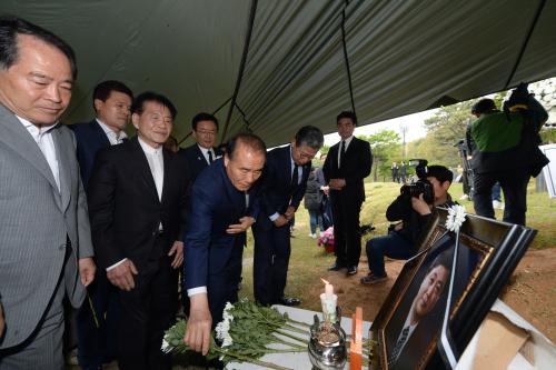 ÀåÈÖ±¹ ±¤Áֽñ³À°°¨Àº "¾Æ¹öÁöÀÎ ±è´ëÁß ´ëÅë·É´Ô°ú ÇÔ²² ¹ÎÁÖÈ¿Í ÀαÇ, ³²ºÏ ÈÇØ¿Í ÆòÈ¡¤ÅëÀÏÀ» À§ÇØ ¾Ö½èÀ¸¸ç, Á¤Ä¡Àû ź¾Ð°ú ¼ö¸¹Àº °íÃʸ¦ ´çÇϰí, °í¹® ÈÄÀ¯ÁõÀ¸·Î ÀÎÇÑ ÆÄŲ½¼¾¾º´À¸·Î ½Ê¿© ³â°£ º´»ó¿¡¼ Åõº´ÇÏ´Ù µ¹¾Æ°¡½Å °íÀο¡ ´ëÇÑ Á¤´çÇÑ Æò°¡°¡ ³»·ÁÁ®¾ß ÇÒ °ÍÀÌ´Ù"¸ç "»ï°¡ °íÀÎÀÇ ¸íº¹À» º÷´Ï´Ù. ÆíÈ÷ ¿µ¸éÇϽöó"°í ¸»Çß´Ù.