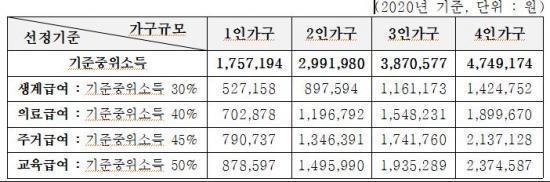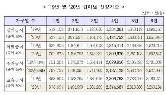 »ý°è±Þ¿© ¼±Á¤±âÁØÀº Áö³ÇØ ¼ÒµæÀÎÁ¤¾× 4ÀÎ ±âÁØ 138¸¸4,000¿ø ÀÌÇÏ¿¡¼ ¿ÃÇØ 142¸¸4,000¿ø ÀÌÇÏ·Î Àü³â ´ëºñ 2.94% ÀλóµÇ¾î ±Þ¿©º° ¼Òµæ ÀÎÁ¤¾× »êÁ¤±âÁØÀÌ º¯°æµÆ´Ù.