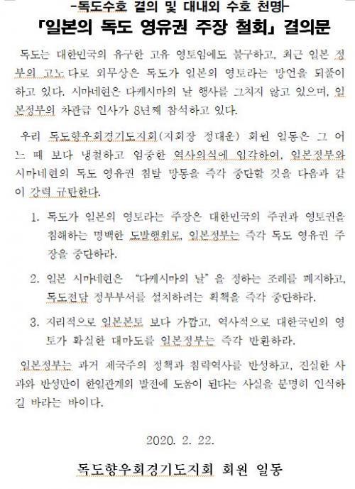 ÀÌÀÏ±Ô »ç¹«±¹Àå(±¤¸í ½ÃÀÇ¿ø)ÀÇ »çȸ·Î ÁøÇàµÈ ±Ôź´ëȸ¿¡ ÁöȸÀå Á¤´ë¿î ÀÇ¿ø(°æ ±âµµÀÇȸ ±âȹÀçÁ¤À§¿øÀå, ´õ¹ÎÁÖ/ ±¤¸í2)Àº ¡ãµ¶µµ°¡ ÀϺ» ¿µÅä¶ó´Â ÁÖÀåÀº ´ëÇѹα¹ÀÇ Áֱǰú ¿µÅä±ÇÀ» Ä§ÇØÇÏ´Â ÇàÀ§·Î, Áï°¢ µ¶µµ ¿µÀ¯±Ç ÁÖÀåÀ» Áß´ÜÇÒ °Í, ¡ã ÀϺ» ½Ã¸¶³×ÇöÀº ¡®´ÙÄɽø¶ÀÇ ³¯¡¯ Á¶·Ê¸¦ ÆóÁöÇϰí, µ¶µµ Àü´ã Á¤ºÎºÎ¼ÀÇ ¼³Ä¡ ȹåÀ» Áß´ÜÇÒ °Í, ¡ã ÀϺ» º»Å亸´Ù °¡±õ°í, ¿ª»çÀûÀ¸·Îµµ ´ëÇѹα¹ÀÇ ¿µÅäÀÎ ´ë¸¶µµ¸¦ Áï°¢ ¹ÝȯÇÒ °Í µîÀÌ ´ã±ä °áÀǹ®À» ³¶µ¶Çß´Ù.