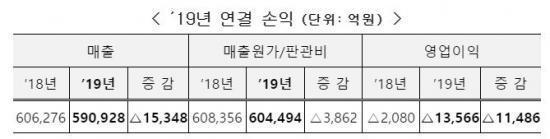 ¡Û ¡¯19³â ¿¬°á±âÁØ ¸ÅÃâ 59Á¶ 928¾ï¿ø, ¿µ¾÷¼Õ½Ç 1Á¶ 3,566¾ï¿øÀ¸·Î Àü³â´ëºñ ¸ÅÃâÀº 1Á¶ 5,348¾ï¿ø, ¿µ¾÷ÀÌÀÍÀº 1Á¶ 1,486¾ï¿ø °¨¼Ò