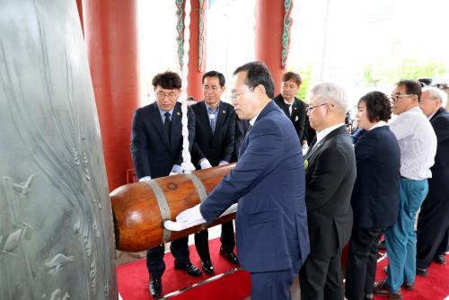 ¹ÎÁÖÀÇ Á¾Àº ¹ÎÁÖ¿Í ÀαÇ, ÆòÈÀÇ µµ½Ã ±¤ÁÖ¸¦ »ó¡ÇÏ´Â Àǹ̸¦ ´ã¾Æ Áö³ 2005³â Á¦À۵ƴÙ. Á¾ÀÇ ³ôÀÌ´Â 4.2m, ¹«°Ô´Â 8150°üÀ¸·Î 8¡¤15¿Í 5¡¤18À» ÇÔ²² ±â¸®°í Á¶±¹ÅëÀÏÀ» ¹Ù¶ó´Â Àǹ̸¦ ´ã°í ÀÖ´Ù.