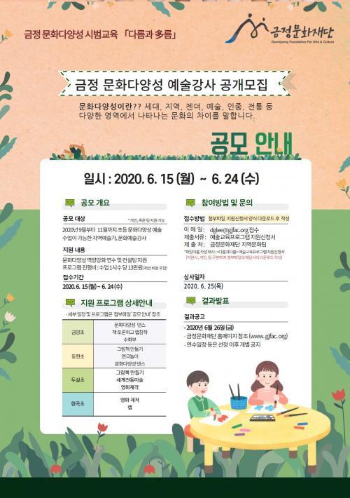 ¡®´Ù¸§°ú Òý¸§¡¯ÀÇ ¿î¿µÀ» À§ÇØ ±ÝÁ¤¹®ÈÀç´ÜÀº 4°³ ÃʵîÇб³ÀÇ µ¿¾Æ¸®¹Ý¿¡¼ ¹®È´Ù¾ç¼º ¿¹¼ú±³À°À» ´ã´çÇÒ ¿¹¼ú°»ç¸¦ ¿À´Â 24ÀϱîÁö ¸ðÁýÇÑ´Ù.