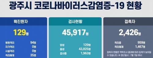 ³ª¸ÓÁö´Â ±¤ÁÖ 126¹ø(50´ë ¿©¼º¡¤³²±¸)Àº ±¤¸¤»ç¿¡¼, 129¹ø(50´ë ¿©¼º¡¤±¤»ê±¸)Àº SM»ç¿ì³ª¿¡¼ °¢°¢ °¨¿°µÈ °ÍÀ¸·Î ÀüÇØÁ³´Ù.123¹ø°ú 129¹øÀº ¹«Áõ»ó È®ÁøÀÚÀ̸ç, ´Ù¸¥ È®ÁøÀÚ 5¸íÀº ¿ÀÇÑ¡¤ÀÎÈÄÅ롤¼³»ç¡¤Ä๰ µî ´Ù¾çÇÑ Áõ»óÀ» º¸¿´´Ù°í ¾Ë·ÁÁ³´Ù.