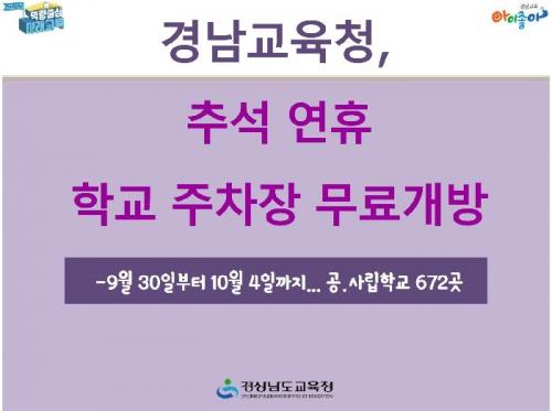 ÁÖÂ÷ÀåÀ» ¹«·á°³¹æÇÏ´Â Çб³(±³À°±â°ü)´Â 9¿ù 28ÀÏ(¿ù)ºÎÅÍ °æ»ó³²µµ±³À°Ã» ¾Ë¸²¸¶´ç, °øÀ¯´©¸®, °ø°øµ¥ÀÌÅÍÆ÷ÅÐ µ¥ÀÌÅÍã±â¿¡¼ È®ÀÎÇÒ ¼ö ÀÖ´Ù°í ÀüÇß´Ù.