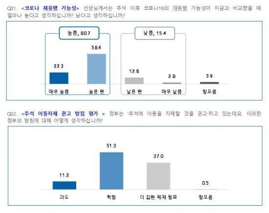 Áö³ ¸íÀý ´ëºñ À̵¿°èȹ °¨¼Ò´Â Äڷγª ÀçÈ®»ê¿¡ ´ëÇÑ ¿ì·Á¿¡¼ ºñ·ÔµÈ °ÍÀ¸·Î º¸ÀδÙ. Ãß¼® ÀÌÈÄ Äڷγª ÀçÀ¯Çà °¡´É¼º¿¡ ´ëÇÏ¿© ¼¿ï ½Ã¹Î 10¸í Áß 8¸í(80.7%)Àº ÀçÀ¯Çà °¡´É¼ºÀÌ ³ô´Ù°í ÀÀ´äÇß´Ù. ÀÌ¿Í °ü·ÃÇÏ¿© Á¤ºÎÀÇ Ãß¼® À̵¿ÀÚÁ¦ ±Ç°í¿¡ ´ëÇÑ ÀǰßÀ» ¹°¾îº» °á°ú, ½Ã¹Î Àý¹ÝÀÌ»ó(51.3%)ÀÌ ¡®ÀÚÁ¦ ±Ç°í¡¯ ¼öÁØÀÇ Á¤ºÎ °³ÀÔÀÌ ÀûÀýÇÏ´Ù°í º¸¾Ò°í, ÀÀ´äÀÚÀÇ 37%´Â ´õ °ÇÑ Á¦Àç°¡ ÇÊ¿äÇÏ´Ù´Â ÀǰßÀ» º¸¿´´Ù. ¡®ÀÚÁ¦ ±Ç°í¡¯°¡ °úµµÇÏ´Ù´Â ÀǰßÀº ÀüüÀÇ 11.2%¿¡ ºÒ°úÇß´Ù.