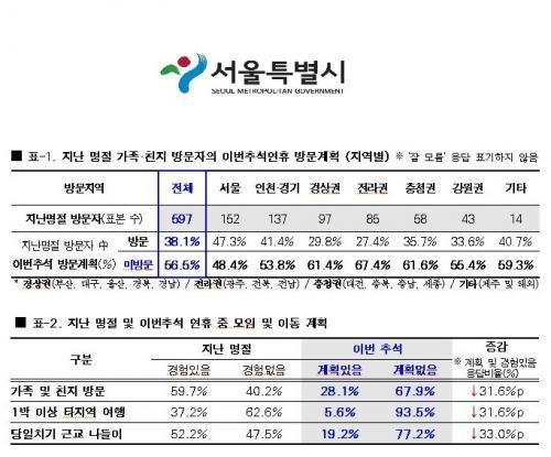 Á¶»ç¿¡ µû¸£¸é, ¼¿ï½Ã¹Î Áß 67.9%´Â À̹ø Ãß¼® ¿¬ÈÞ¿¡ °°ÀÌ »ìÁö ¾Ê´Â °¡Á· ¹× Ä£Áö¸¦ ¹æ¹®ÇÏÁö ¾ÊÀ» °èȹÀ̶ó°í ¹àÇûÀ¸¸ç, ¹æ¹® °èȹÀÌ ÀÖ´Â ½Ã¹ÎÀº Àüü ÀÀ´äÀÚ Áß 28.1%À¸·Î ÀÌ´Â Áö³ ¸íÀý °¡Á·¡¤Ä£Áö¸¦ ¹æ¹®ÇÑ °æ¿ì(59.7%) ´ëºñ 31.6%p³ª °¨¼ÒÇÑ ¼öÄ¡À̰í, À̹ø Ãß¼® °¡Á·¡¤Ä£Áö¸¦ ¹æ¹®ÇÏÁö ¾Ê°Ú´Ù´Â ÀÀ´äÀÚ(1000¸í Áß 697¸í) Áß 79.2%´Â ¹Ì¹æ¹® ÀÌÀ¯¸¦ ¡®Äڷγª ¶§¹®¡¯À̶ó°í ÀÀ´äÇß´Ù. ƯÈ÷ Áö³ ¸íÀý¿¡ °¡Á·¡¤Ä£Áö¸¦ ¹æ¹®ÇÑ »ç¶÷µé Áß Àý¹ÝÀÌ»ó(56.5%)Àº À̹ø Ãß¼®¿¡´Â ¹æ¹®ÇÏÁö ¾Ê°Ú´Ù°í ÀÀ´äÇß´Ù.