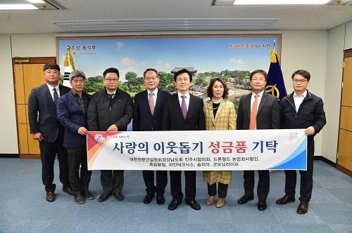 À̳¯ ±âŹ½Ä¿¡´Â ´ëÇÑÀü¹®°Ç¼³Çùȸ ÁøÁÖ½ÃÇùÀÇȸ(ȸÀå ±èÁÖ»ý)°¡ ¼º±Ý 600¸¸¿ø, ¢ßµå·Ð¿ùµå ³ó¾÷ȸ»ç¹ýÀÎ(´ëÇ¥ ±èÈñÈ)ÀÌ ¼º±Ý 500¸¸¿ø, ÈÞ¸²È²Ä¥(´ëÇ¥ Á¶Ã¢¼ö)¿¡¼ ÈÞ´ë¿ë ¼Õ¼Òµ¶Á¦ 2000°³, ÆÄÀÎÅ×Å©´Ð½º(´ëÇ¥ ±è±Ù¿ì)¿¡¼ Äڷγª19 ¿¹¹æ¼¼Æ® 200°³, ¼ûÇǾÆ(´ëÇ¥ Ȳ±Ý¿Á)¿¡¼ µ§Å»¸¶½ºÅ© 2¸¸°³, (ÁÖ)±Â¸ð´× ¶óÀÌÇÁ(´ëÇ¥ Ȳ¿ë¿î)¿¡¼ µ§Å»¸¶½ºÅ© 6000°³¸¦ ±âŹÇß´Ù.