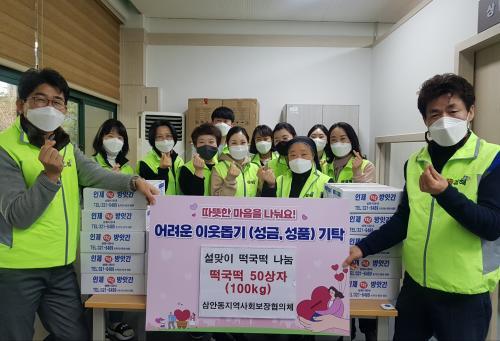 ÀÌ ³¯ Çà»ç´Â »ï¾Èµ¿Áö¿ª»çȸº¸ÀåÇùÀÇü¿¡¼ ¶±±¹ ¶± 50»óÀÚ(100KG)À» ¸¶·ÃÇÏ¿© °ü³» Àú¼Òµæ °èÃþ ¹× ¾Æµ¿º¹Áö½Ã¼³¿¡°Ô Áö¿øÇÏ¿´À¸¸ç, Áö¿ª»çȸº¸ÀåÇùÀÇü À§¿øµéÀº Äڷγª·Î Èûµç ½Ã±â¸¦ º¸³»°í ÀÖ´Â ¾î·Á¿î ÀÌ¿ôÀ» Á÷Á¢ ã¾Æ ºË°í ¾ÈºÎ¿Í À§·Î¸¦ °®´Â ½Ã°£À» °¡Á³´Ù.