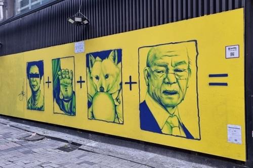 13ÀÏ ¼¿ï Á¾·Î±¸ °üöµ¿ÀÇ Áß°í¼Á¡ °Ç¹° ¿Üº®¿¡ ¹«¼ÓÀÎ ³í¶õÀ» ÀÏÀ¸Ä×´ø À± Èĺ¸ÀÇ ¼Õ¹Ù´Ú 'èÝ(¿Õ)'ÀÚ ±ÛÀÚ¿Í, »ç°ú ÈñÈÈ ³í¶õÀÌ ÀϾú´ø '°³ »ç°ú' ±×¸²ÀÌ ±×·ÁÁ® ÀÖ¾ú´Ù.