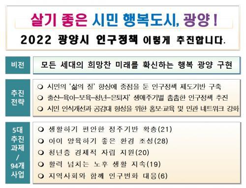 Àα¸¹®Á¦ Àνݳ¼± ºÐ¾ß´Â Àα¸¿µÇâ °ËÅäÁ¦ ÃßÁø, ±¤¾ç½Ã ÀüÀÔÀå·Á±Ý Áö¿øÀÌ °è¼Ó ÃßÁøµÇ°í, ±¤¾ç½Ã Àα¸ÁÖ°£ ¿î¿µ, Àα¸¡¤Ã»³â Á¤Ã¥ ºê·£µå Àü·«Àû È«º¸°¡ ½Å±Ô·Î ÃßÁøµÈ´Ù.