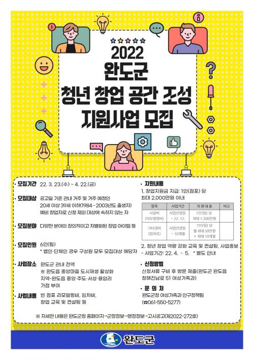 ´Ù¾çÇÑ ºÐ¾ßÀÇ Âü½ÅÇÑ ¾ÆÀÌÅÛÀ¸·Î â¾÷À» ¿øÇϴ û³âÀ̶ó¸é º» »ç¾÷ÀÇ ÀÚ°Ý ¿ä°ÇÀ» È®ÀÎÇÑ ÈÄ 4¿ù 22ÀϱîÁö ½Åû ¼·ù¸¦ ±¸ºñÇØ ¿Ïµµ±º ¿©¼º°¡Á·°ú Àα¸Á¤Ã¥ÆÀÀ¸·Î ¹æ¹® ½ÅûÇÏ¸é µÈ´Ù.