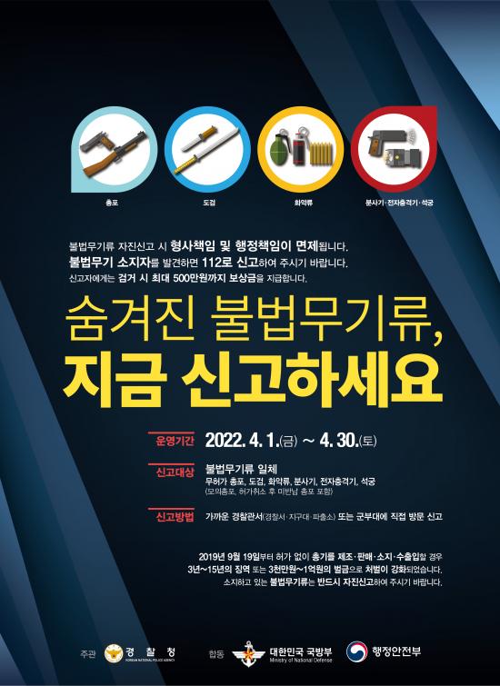 ƯÈ÷ ºÒ¹ý¹«±â·ù¸¦ ¼ÒÁöÇϰí Àְųª ºÒ¹ý¹«±â ¹Ð°Å·¡ Á¶Á÷, ºÒ¹ý À¯Åë°æ·Î¸¦ ½Å°íÇÑ »ç¶÷¿¡°Ô´Â ÃÖ´ë 500¸¸¿øÀÇ °Ë°Å º¸»ó±ÝÀ» Áö±ÞÇÒ ¹æÄ§ÀÌ´Ù.