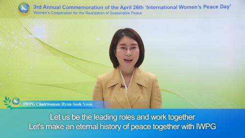 À±Çö¼÷ ´ëÇ¥´Â ±â³ä»ç¿¡¼ ¡°IWPG´Â ÀÌ ½Ã´ë¿¡ Æòȸ¦ ÀÌ·ç¾î ¿ì¸® Èļյ鿡°Ô ÀüÀïÀÌ ¾ø´Â ¾Æ¸§´Ù¿î Áö±¸ÃÌÀ» À¯»êÀ¸·Î ¹°·ÁÁÖÀÚ´Â ´ÙÁüÀ¸·Î 3³â Àü À̳¯À» ¡®¼¼°è¿©¼ºÆòÈÀÇ ³¯¡¯·Î ¼±Æ÷Çß´Ù¡±¸é¼ ¡°2012³â ÀÌÈÄ ÇØ¸¶´Ù 10¸¸¿©¸íÀÌ ºÐÀïÀ¸·Î ÀÎÇØ »ç¸ÁÇϰí ÀÖ°í, ¸Å³â 50°ÇÀÌ ³Ñ´Â ±¹°¡ Â÷¿øÀÇ ºÐÀïÀÌ ÀϾ´Â °ÍÀÌ ¿À´Ã³¯ÀÇ Çö½Ç¡±À̶ó°í ¸»Çß´Ù. ±×·¯¸é¼ À± ´ëÇ¥´Â ¡°¹®Á¦ ÇØ°áÀÇ ´äÀº ¸Ö¸® ÀÖÁö ¾Ê´Ù. ÆòÈ Çù·Â´ÜüÀÎ HWPLÀÌ 2016³â 3¿ù 14ÀÏ °øÇ¥ÇÑ ¡®Áö±¸ÃÌ ÀüÀïÁ¾½Ä ÆòÈ ¼±¾ð¹®¡¯ÀÌ ¹Ù·Î ±×°Í. ¼±¾ð¹®¿¡´Â ÀüÀïÀÇ ¿øÀÎÀ» ÇØ¼ÒÇØ ÀüÀï ¹ß¹ßÀ» ¾ïÁ¦ÇÏ´Â µ¿½Ã¿¡ ÀüÀïÁ¾½Ä ÀÌÈÄ Àü ¼¼°è°¡ À̸¦ Áö¼ÓÇϵµ·Ï ÇÏ´Â ÈļÓÁ¶Ä¡±îÁö ¾ð±ÞµÅ ÀÖ´Ù¡±¸ç ¡°Áö¼Ó°¡´ÉÇÑ ÆòÈ ½ÇÇàÀ» À§ÇØ ¿©¼ºÀÇ ÈûÀ» ¹ßÈÖÇØ ´Þ¶ó¡±°í ´çºÎÇß´Ù.