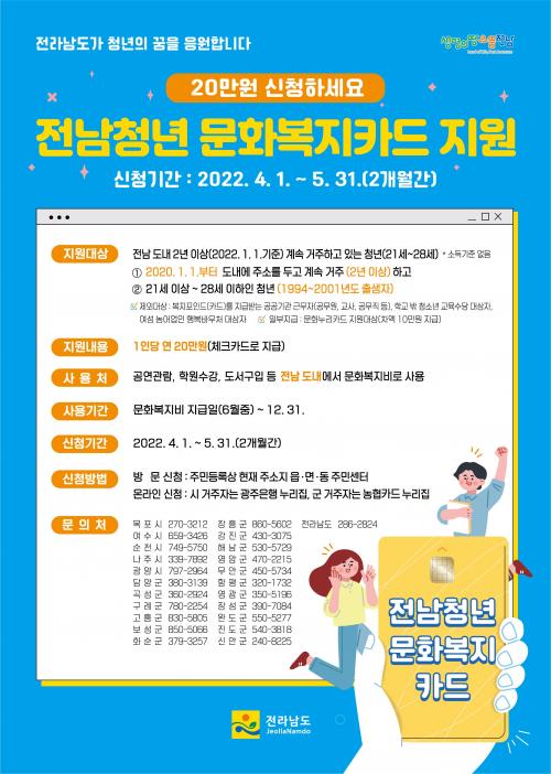 ¿ÃÇØ óÀ½À¸·Î ½ÃÇàµÇ´Â ¡®Àü³²Ã»³â ¹®Èº¹ÁöÄ«µå Áö¿ø»ç¾÷¡¯Àº 2020³â 1¿ù 1ÀϺÎÅÍ Àü¶ó³²µµ¿¡ ÁÖ¼Ò¸¦ µÎ°í 2³â ÀÌ»ó °è¼Ó °ÅÁÖÇϰí ÀÖ´Â 21~28¼¼(1994~2001³â»ý) û³â¿¡°Ô 1ÀÎ´ç ¿¬ 20¸¸ ¿øÀÇ ¹®È»ýȰºñ¸¦ Áö±ÞÇÏ´Â »ç¾÷ÀÌ´Ù.