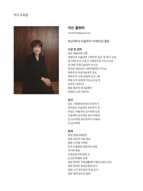 È«Çö¹Ì ÀÛ°¡´Â ±¤¾çû³âÀÛ°¡È¸ ȸÀå°ú »ç´Ü¹ýÀÎ Çѱ¹¹Ì¼úÇùȸ ±¤¾çÁöºÎ ȸ¿øÀ¸·Î Ȱµ¿ ÁßÀ¸·Î ÈÄÇÐ ¾ç¼º°ú Àå¾ÖÀÎÀÇ ¹®È¿¹¼ú Ȱµ¿À» À§ÇØ ³ë·ÂÇϰí ÀÖÀ¸¸ç, ºÎÄ£ÀΠû¿ø È«Àº¿Á ÀÛ°¡ÀÇ µÚ¸¦ ÀÌ¾î ¼¿¹°¡·Î¼ ÀÛǰ Ȱµ¿À» ²ÙÁØÈ÷ ÇØ¿À°í ÀÖ´Ù.