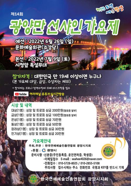 ¸¸ 19¼¼ ÀÌ»óÀÌ¸é ´©±¸³ª °¡¿äÁ¦¿¡ Âü¿©ÇÒ ¼ö ÀÖÀ¸¸ç, ±¤¾ç½Ã Á¦14ȸ ±¤¾ç¸¸ ¼±»þÀÎ °¡¿äÁ¦ ºÙÀÓÆÄÀÏÀÇ ÀüȹøÈ£·Î ½Åû °¡´ÉÇÏ´Ù.