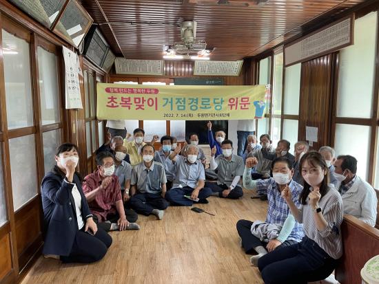 Áö³ 7¿ù 14ÀÏ µÎ¿ø¸é 12°³ ±â°ü»çȸ´Üü(³óÇù, ¹ø¿µÈ¸, ÀÌÀå´Ü, üÀ°È¸, »õ¸¶À»ÁöµµÀÚȸ, ºÎ³àȸ µî)¿¡¼´Â ¾î¸£½ÅµéÀÇ ¿ø±âȸº¹À» À§ÇÑ ½Ã¿øÇÑ Äá¹°, ¼öÀ°, ±èÄ¡, ¶±, °úÀÏ µîÀ» Àü´ÞÇϰí Äڷγª 19 ¿¹¹æ ¹× Æø¿°½Ã Çൿ¿ä·É ¾È³», ¿¡¾îÄÁ °¡µ¿»óÅ µî ½Ã¼³¹° Á¡°ËÀ» ½Ç½ÃÇß´Ù.