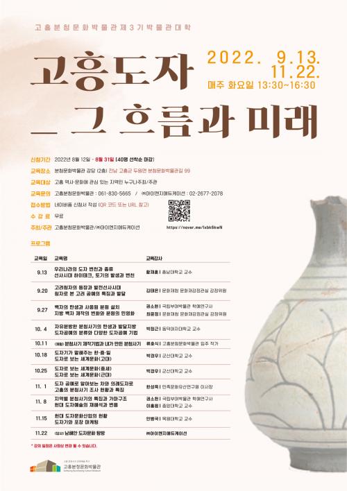 À̹ø ¹Ú¹°°ü ´ëÇÐÀº "°íÈï µµÀÚ-±× È帧°ú ¹Ì·¡: °íÈïÁö¿ª µµÀÚ º¯Ãµ°ú ºÐû»ç±â"¶ó´Â Á¦¸ñÀ¸·Î ¿À´Â 9¿ù 13ÀϺÎÅÍ 11¿ù 22ÀϱîÁö 10ÁÖ µ¿¾È ¸ÅÁÖ È¿äÀÏ ¿ÀÈÄ 1½Ã 30ºÐºÎÅÍ 4½Ã 30ºÐ±îÁö 1ÀÏ 2°Á¾¿ ¹Ú¹°°ü °´ç¿¡¼ ÁøÇàµÉ ¿¹Á¤À̸ç, ¿À´Â 8¿ù 12ÀϺÎÅÍ 9¿ù 7ÀϱîÁö ¼±Âø¼øÀ¸·Î ¼ö°»ýÀ» ¸ðÁýÇÑ´Ù.