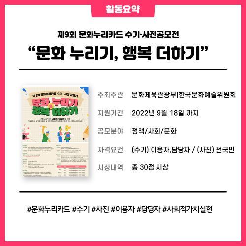 À̹ø °ø¸ðÀüÀº ¼ö±â¿Í »çÁø ºÐ¾ß·Î ³ª´©¾î ÁøÇàµÇ¸ç, ¼ö±â´Â ¹®È´©¸®Ä«µå ÀÌ¿ëÀÚ¿Í ´ã´çÀÚ(Áֹμ¾ÅÍ, ÁÖ°üó, º¹Áö½Ã¼³ ´ã´çÀÚ ¹× °¡¸ÍÁ¡ÁÖ)°¡ Âü¿©ÇÒ ¼ö ÀÖÀ¸¸ç, »çÁø ºÐ¾ß´Â ±¹¹Î ´©±¸³ª Âü¿©ÇÒ ¼ö ÀÖ´Ù.